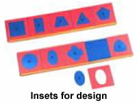 The child's hands and fingers are being prepared for writing through use of various sensorial materials, then later, they learn to control a pencil when using the insets for design, which allow the child to practice drawing the shapes which compose the letters of the alphabet. |